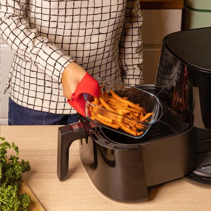 La fuente cuadrada de vidrio OCUISINE es perfecta para cocinar en freidora de aire, horno o microondas. Su diseño resistente al calor asegura una cocción pareja y práctica, ideal para preparar recetas dulces y saladas en tu cocina diaria.